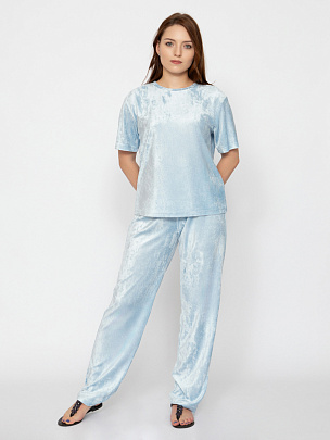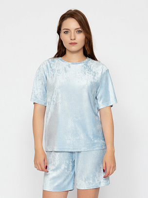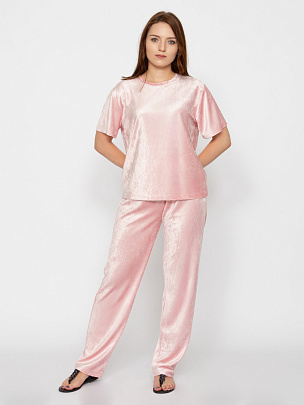 Блузка свободного силуэта с рукавами-крылышками. Спереди блестящая цветная шелкография. Горловина обработана окантовкой из основного полотна. Сзади застежка на пуговицу. Рукава-реглан со сборкой. Верхний слой из гофрированная. Нижний слой из основного полотна. Ширина верхнего крылышка 8 см, нижнего 10см.