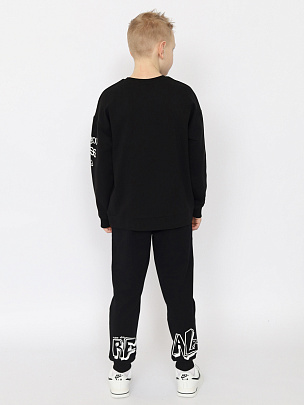 Джемпер с длинными рукавами, притачным поясом и манжетами. Манжеты и пояс выполнены из основного полотна. Горловина круглая с притачным воротником из полотна с добавлением лайкры. Перед и рукав декорированы принтом "Нарушай правила, будущее пренадлежит любознательным, юный и безбашенный, давай будем легендарными".