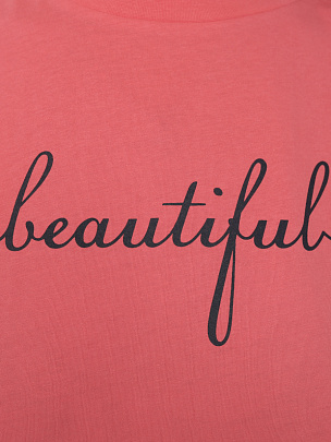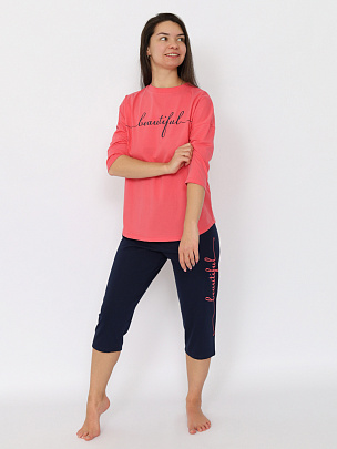 Гладкокрашенная пижама из джемпера и бридж. Джемпер свободного покроя с рукавом 3/4. Горловина обработана притачной бейкой из рибаны с лайкрой. Перед оформлен принтом. Бриджи прямые умеренного объёма длиной ниже колена выполнены из полотна дополнительного цвета. Цельнокроенный пояс обработан плоским швом вподгибку с одновременным прокладыванием резинки. На левой стороне - принт.