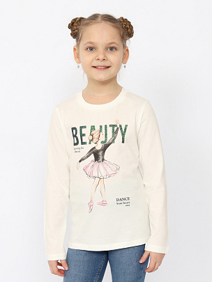 Джемпер для девочки повышенной плотности со спущенным плечем. Киперная лента с люрексом по рукавам. Перед декорирован принтом. Фигурный низ с удлиненной спинкой.