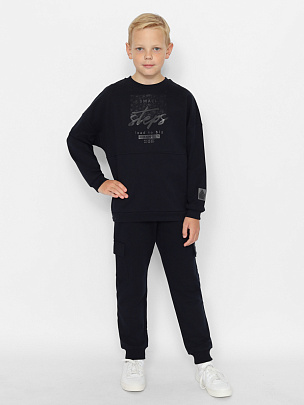 Джемпер для мальчика свободного силуэта с карманом спереди и притачным эластичным поясом по низу. Горловина круглая, обработана притачным воротником из полотна с эластаном. Рукава длинные с эластичными манжетами по низу. Перед джемпера декорирован принтом "Маленькие шаги приводят к большим переменам".