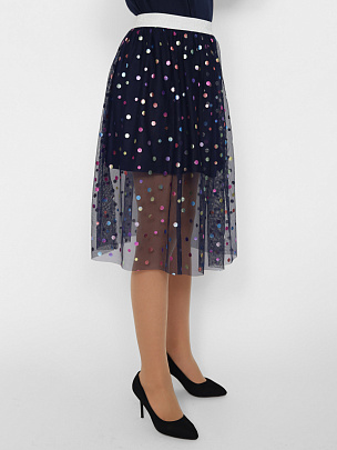 Нарядная двухслойная юбка для девочки из сетки с блестящими кружочками "конфетти". Эластичный пояс с люрексом. Подкладка выполнена из хлопкового трикотажа. Подкладка короче верхнего слоя сетки.