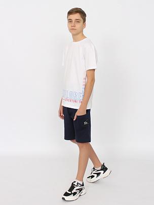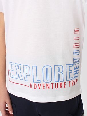Футболка с коротким рукавом. Горловина круглая, обработана узким воротником из полотна с эластаном. Перед оформлен шрифтовым принтом.