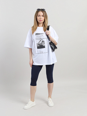 Футболка с коротким рукавом. Горловина круглая, обработана узким воротником из полотна с эластаном. Перед оформлен ярким принтом.
