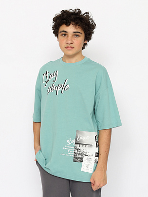 Футболка oversize со спущенным плечом, с коротким рукавом. Горловина круглая, обработана притачной бейкой из рибаны с лакрой. Плечевые швы смещены на перед и отстрочены. Перед оформлен принтом.
